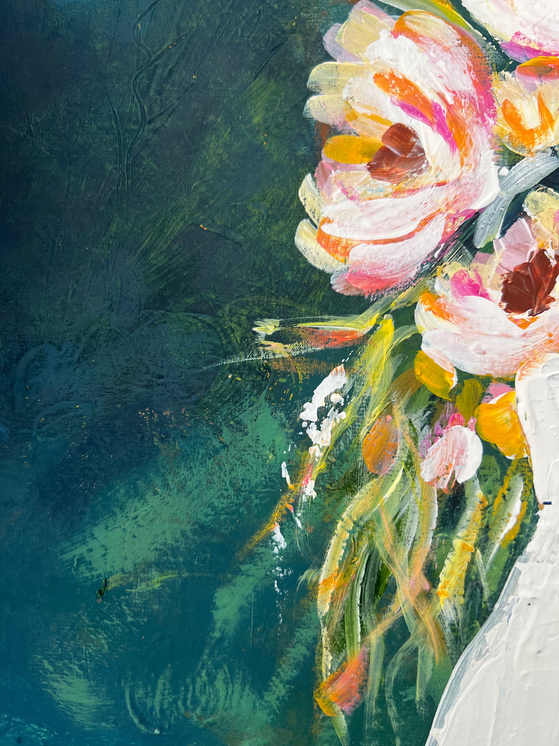 This is a still-life artwork. A bunch of flowers with multi coloured petals in white, pink and yellow colour. They are placed on a table in a white textured vase.
