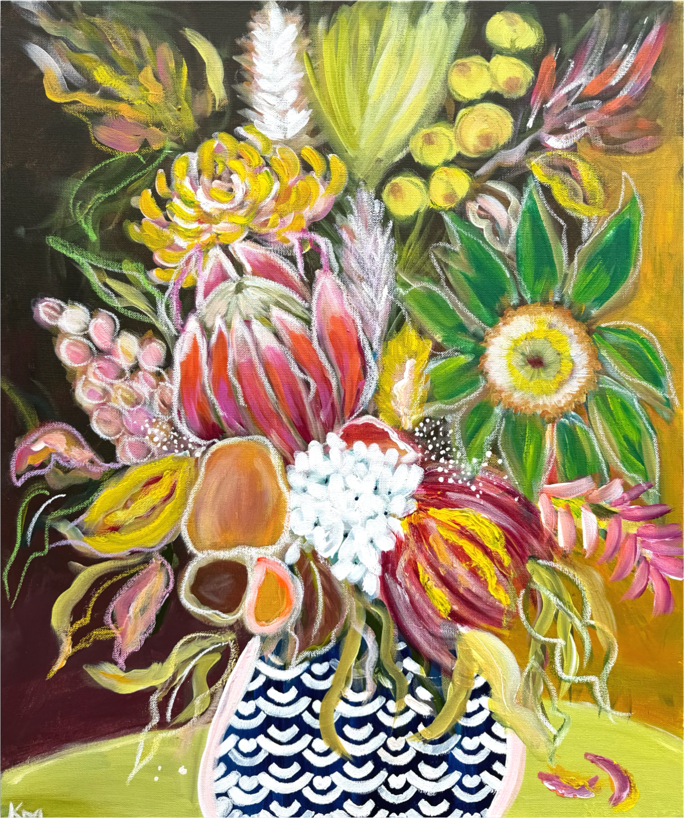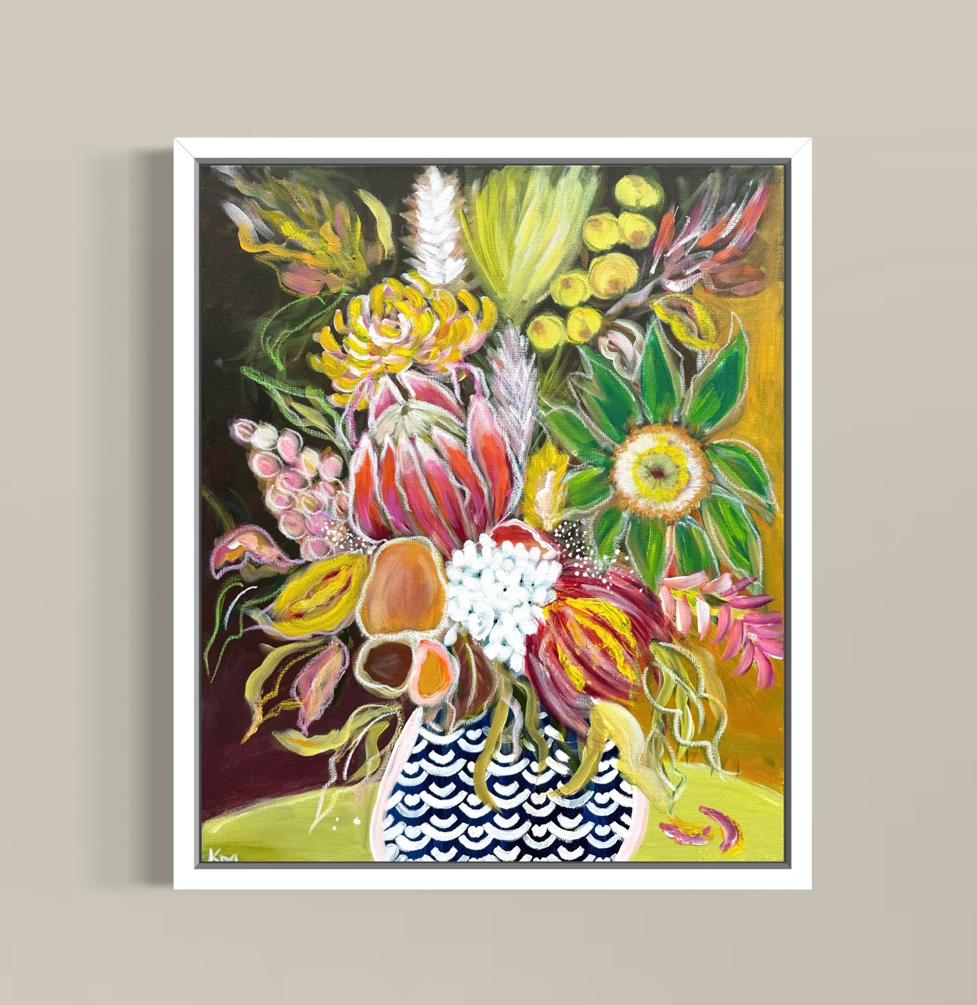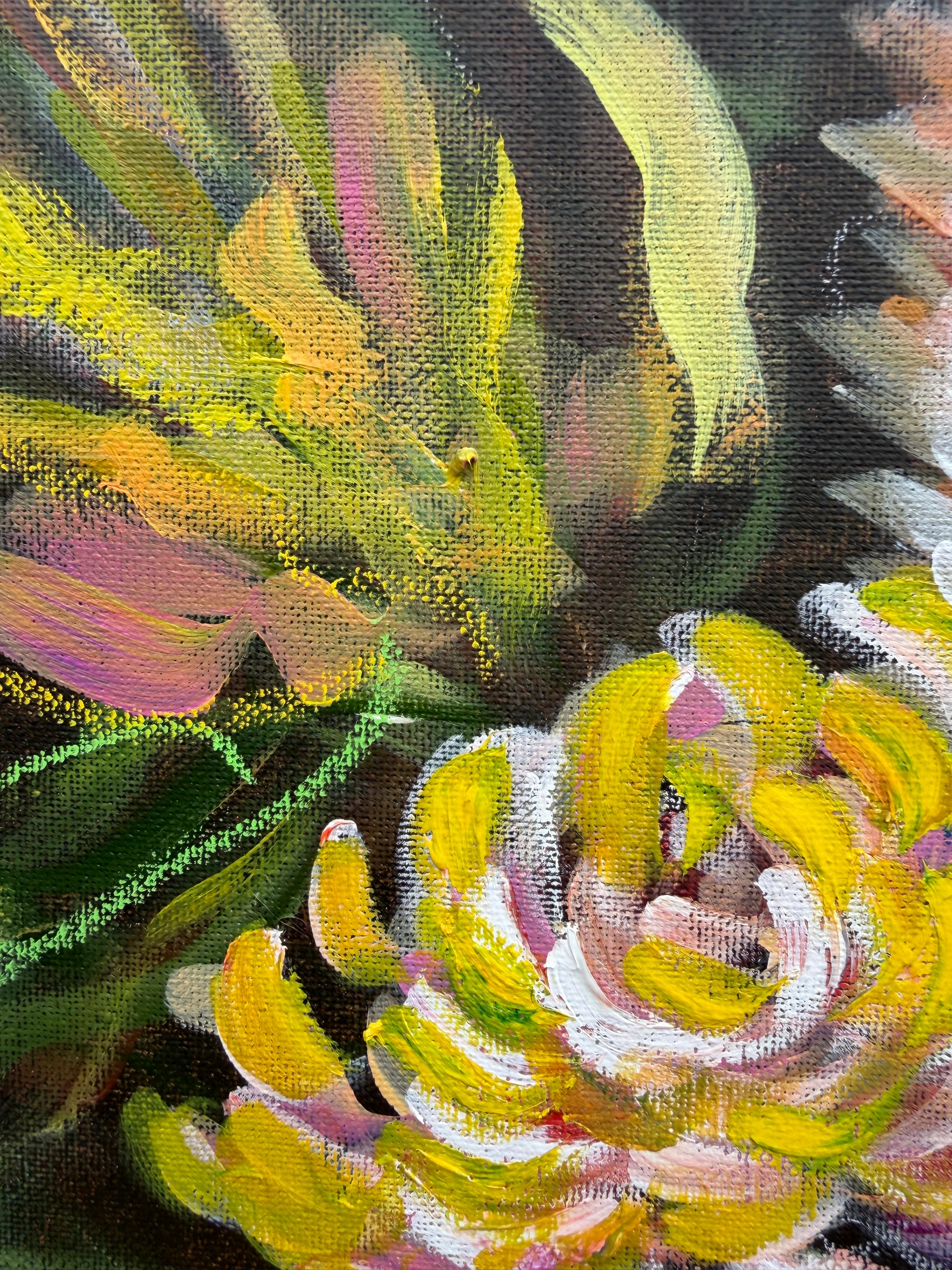 This work celebrates difference as something that strengthens harmony. Each bloom keeps its own shape, color, and energy, while together they create a shared rhythm. The painting welcomes abundance and closeness, suggesting a space where everybody belongs. Like multicultural communities, its vitality comes from exchange, coexistence, and the beauty of many traditions growing side by side.