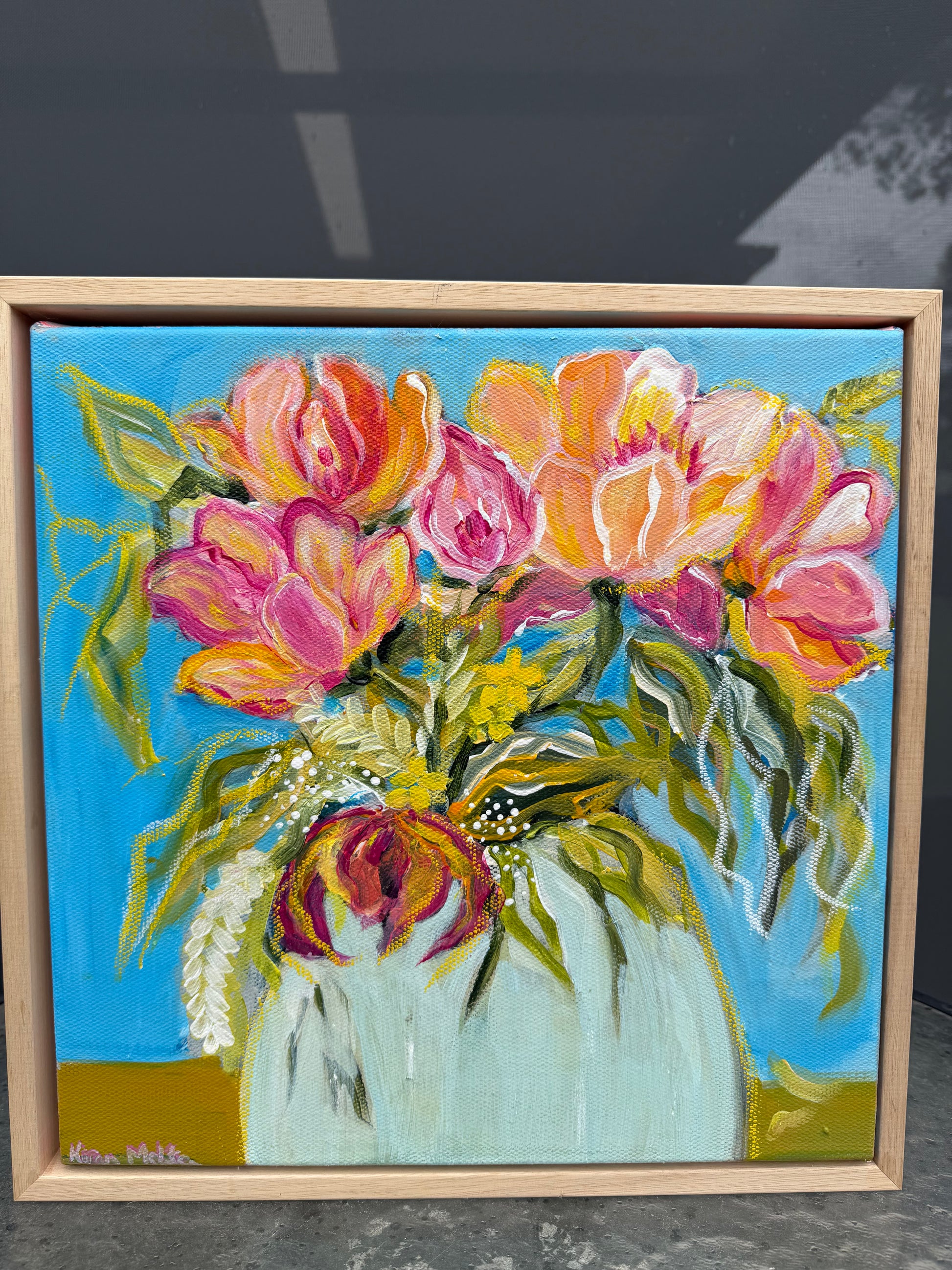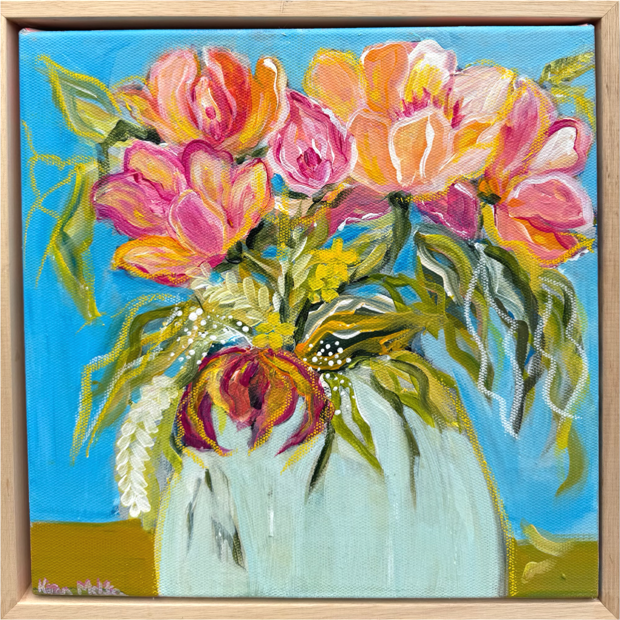 This vibrant floral painting blooms with soft pinks, warm peaches, lively greens, and touches of golden yellow, set against a bright, open sky-blue background. The flowers stretch outward with confidence, painted in expressive, flowing strokes that feel free and full of life.