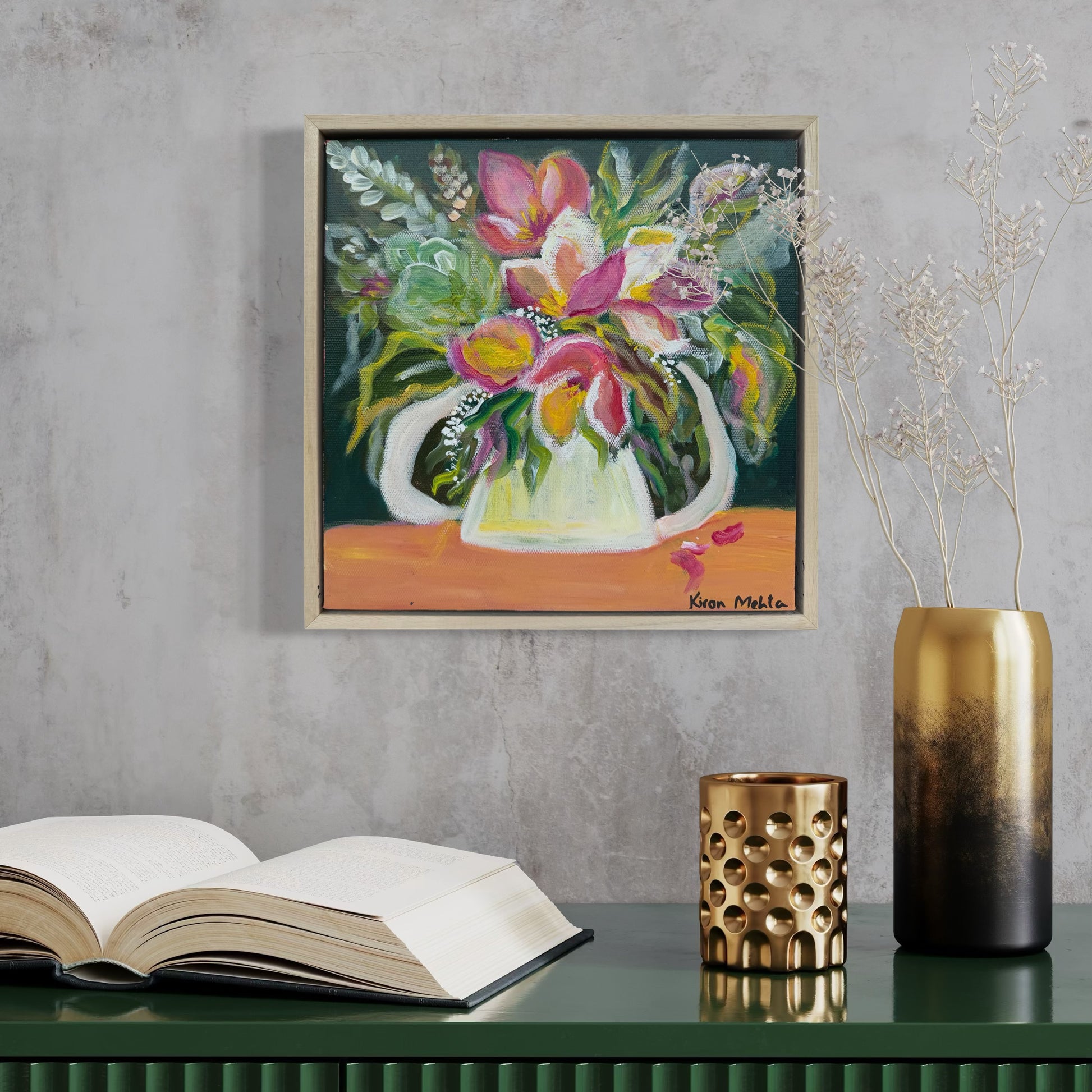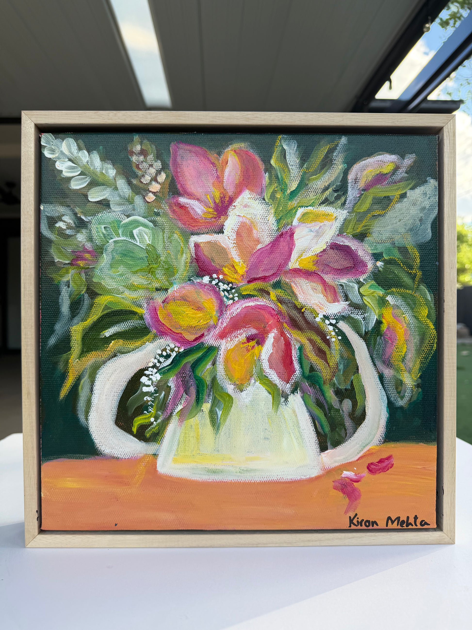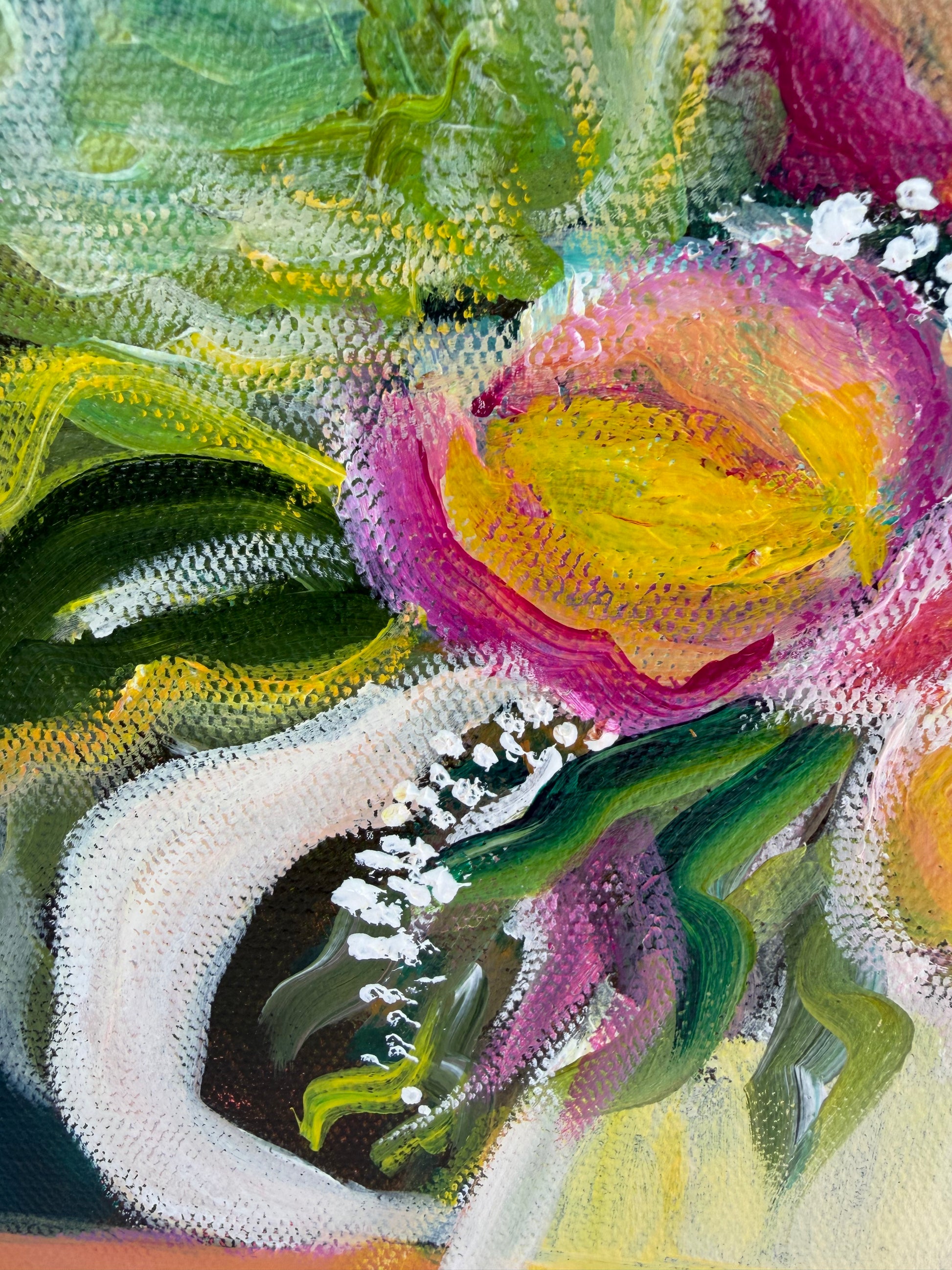 This painting captures a bouquet in full bloom, alive with soft pinks, warm yellows, and fresh greens gathered gently in a simple vessel. The flowers open freely, painted with loose, expressive strokes that give them movement and life, as if they are growing right before our eyes.