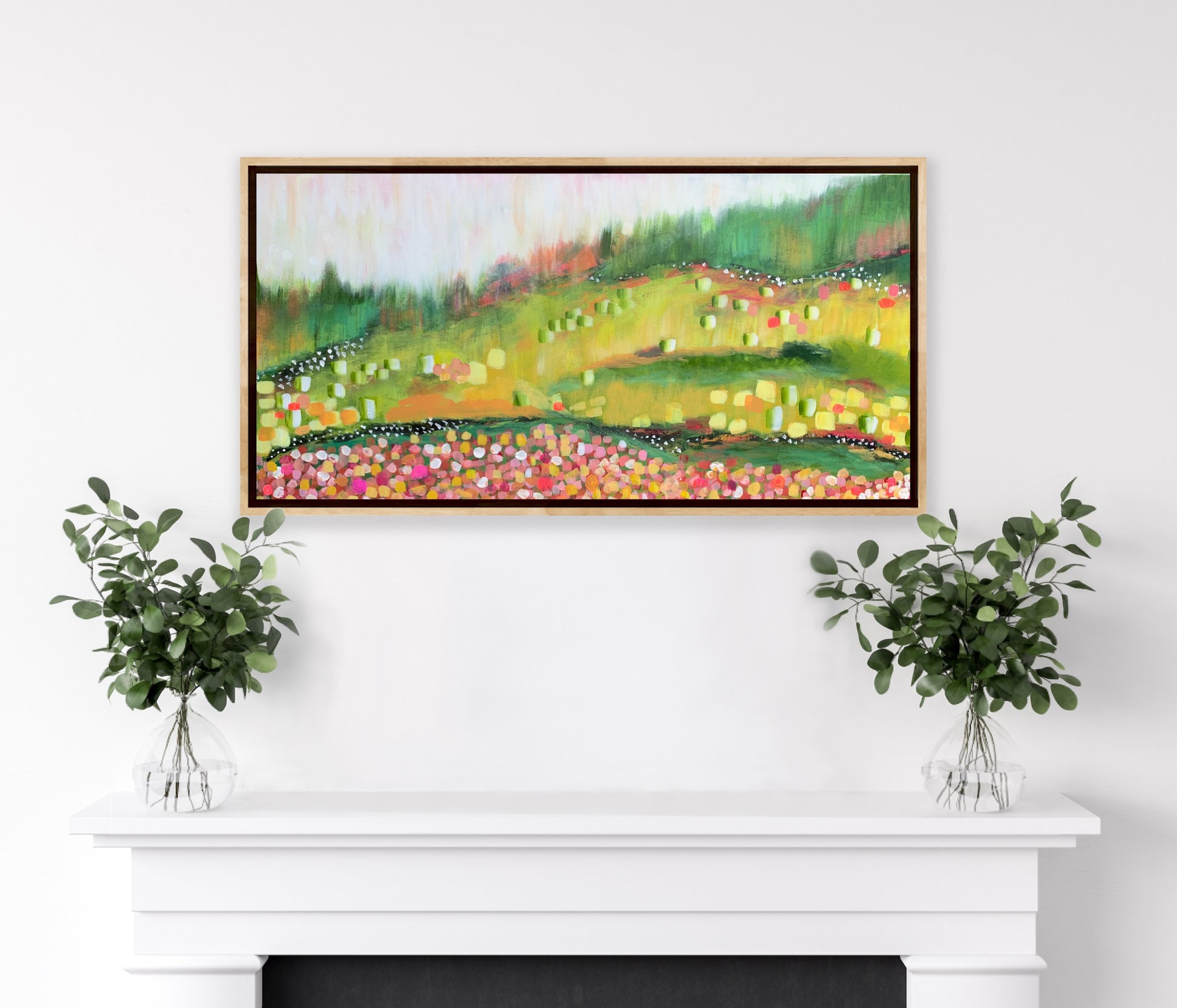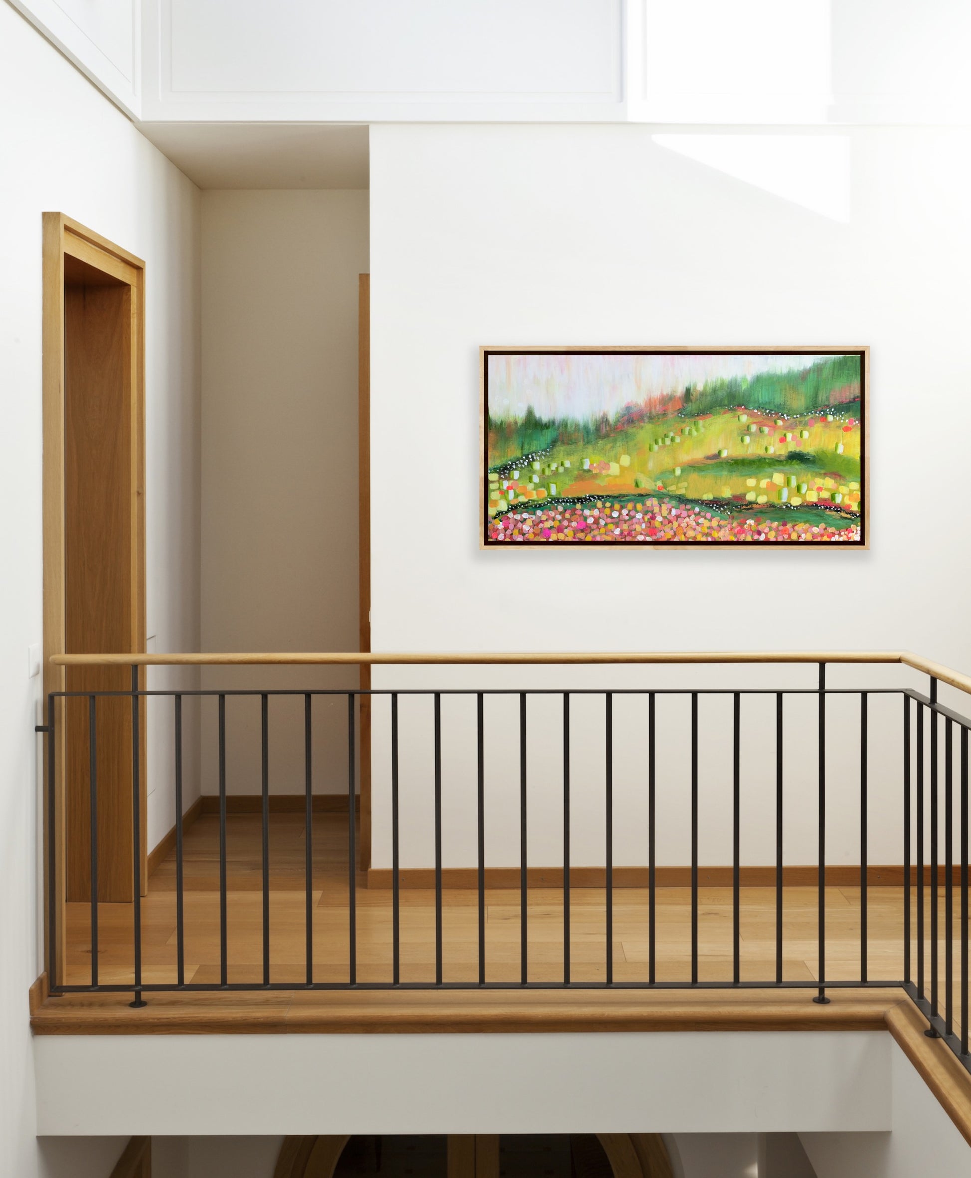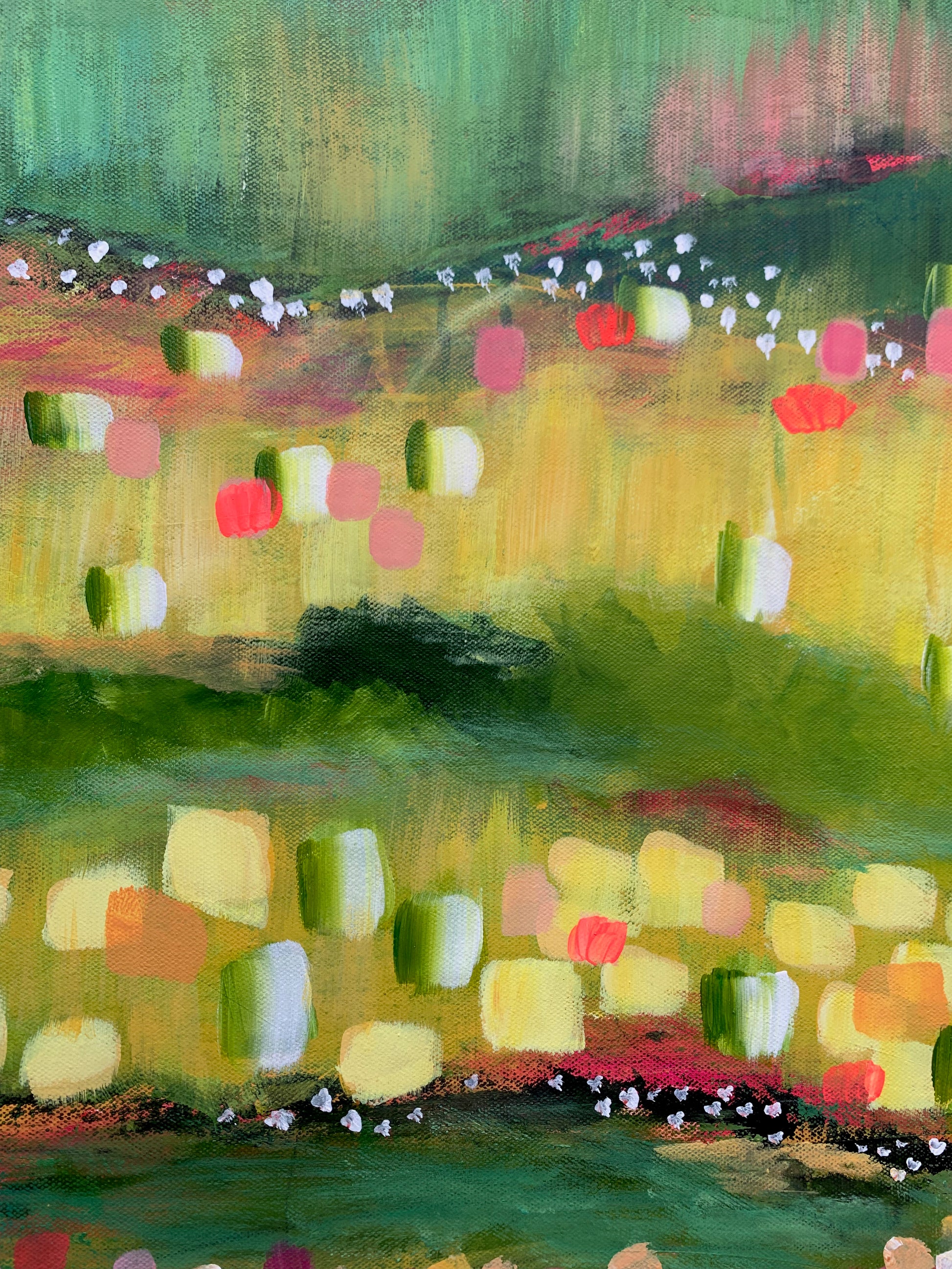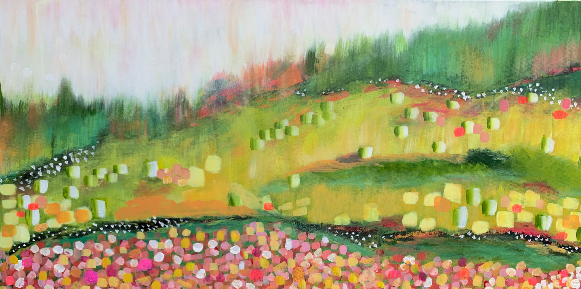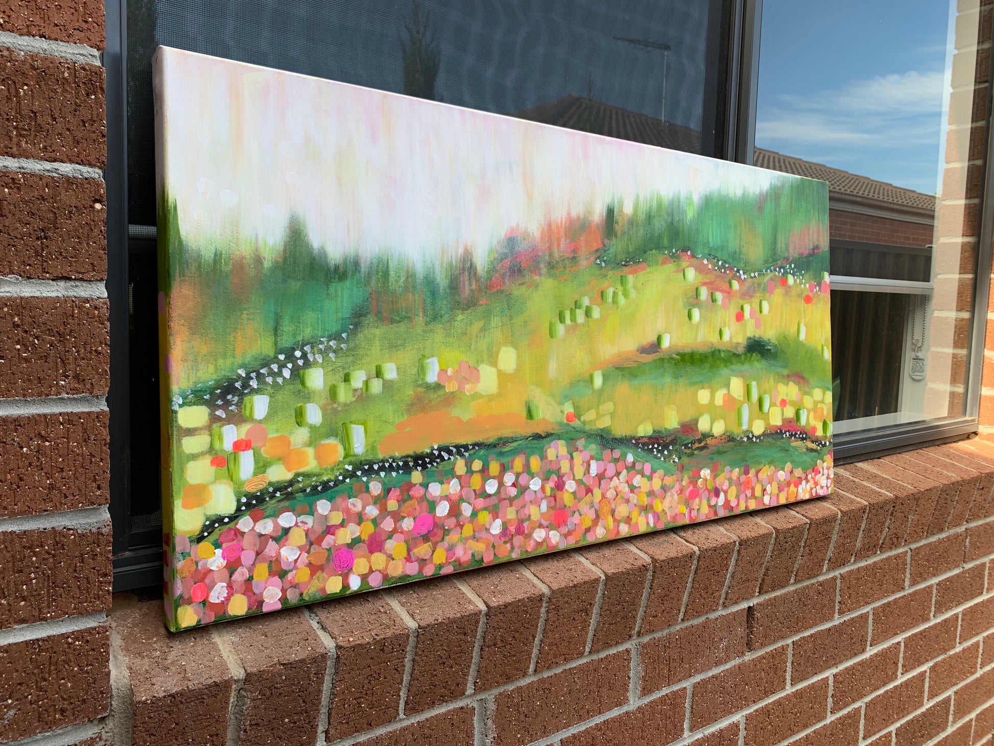 101.6 (w) x 50.8 (h) cms piece painted on a gallery wrapped canvas using variety of mediums - acrylics (fluid and heavy body), soft pastels, colour pencils and other mark making tools.